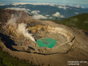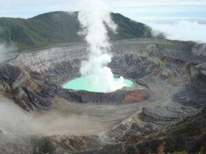 The Poás Volcano is an active 2,708-metre (8,885 ft) stratovolcano. The crater of the volcano is over a mile across and 1050 feet deep.  It has erupted 40 times since 1828, including April 2017.